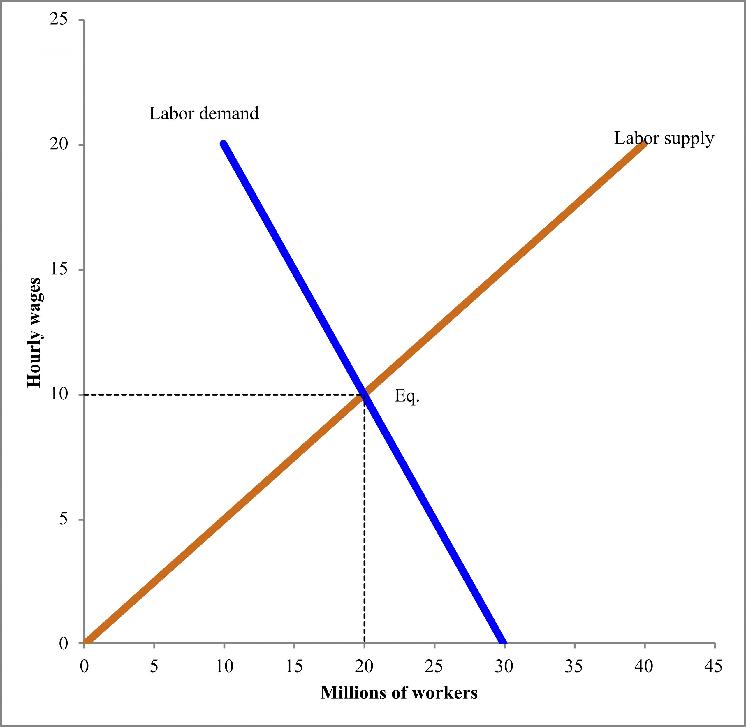 In the labor market, workers are the ones supplying their labor, while firms demand labor. Labor demand from firms depends, in part, on the productivity of workers. Firms only want workers because they will contribute to production. Labor supply by (potential) workers depends, in part, on the population and its characteristics. We will revisit labor supply decisions in the chapter on poverty to better understand how individuals choose how much to work. In the real world there are actually many labor markets, for different types of workers (professors of economics are in a different labor market from professors of political science). For now, we will start with a simple labor market including everyone, like in Figure 2.8, where we see that the labor market equilibrium is 20 million workers being paid $10 an hour.