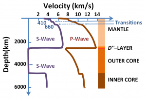 The Earth has been described as ringing like a bell after an earthquake with earthquake energy reverberating inside it. Like other waves, seismic waves refract (bend) and bounce (reflect) when passing through rocks of differing densities. S waves, which cannot move through liquid, are blocked by the Earth’s liquid outer core, creating an S wave shadow zone on the side of the planet opposite to the earthquake focus. P waves, on the other hand, pass through the core, but are refracted into the core by the difference of density at the core–mantle boundary. This has the effect of creating a cone shaped P wave shadow zone on parts of the other side of the Earth from the focus.