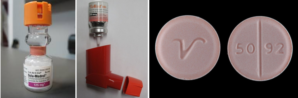 Indications: Corticosteroids are used as replacement therapy in adrenal insufficiency, as well as for the management of various dermatologic, ophthalmologic, rheumatologic, pulmonary, hematologic, and gastrointestinal (GI) disorders. In respiratory conditions, systemic corticosteroids are used for the treatment of acute exacerbations of chronic obstructive pulmonary disease (COPD) and severe asthma. Mineralocorticoids are primarily involved in the regulation of electrolyte and water balance. Glucocorticoids are predominantly involved in carbohydrate, fat, and protein metabolism and also have anti-inflammatory, immunosuppressive, anti-proliferative, and vasoconstrictive effects. Prednisone is perhaps the most widely used of the systemic corticosteroids. It is generally used as an anti-inflammatory and immunosuppressive agent. Hydrocortisone is a commonly used topical cream for itching, and its oral formulation is used to treat Addison’s disease.[11] Methylprednisolone is a commonly used injectable corticosteroid. Fludrocortisone has much greater mineralocorticoid potency and, therefore, is commonly used to replace aldosterone in Addison’s disease.[12] See Figure 9.6[13],[14],[15] for images of various formulations of corticosteroids.