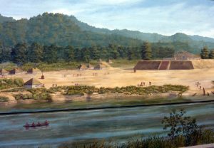 Around 1050, Cahokia experienced what one archaeologist has called a “big bang,” which included “a virtually instantaneous and pervasive shift in all things political, social, and ideological.”[16] The population grew almost 500 percent in only one generation, and new people groups were absorbed into the city and its supporting communities. By 1300, the once-powerful city had undergone a series of strains that led to collapse. Scholars previously pointed to ecological disaster or slow depopulation through emigration, but new research instead emphasizes mounting warfare, or internal political tensions. Environmental explanations suggest that population growth placed too great a burden on the arable land. Others suggest that the demand for fuel and building materials led to deforestation, erosion, and perhaps an extended drought. Recent evidence, including defensive stockades, suggests that political turmoil among the ruling elite and threats from external enemies may explain the end of the once-great civilization.[17]