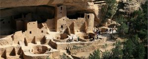 Chaco Canyon in northern New Mexico was home to ancestral Puebloan peoples between 900 and 1300 CE. As many as fifteen thousand individuals lived in the Chaco Canyon complex in present-day New Mexico.[13] Sophisticated agricultural practices, extensive trading networks, and even the domestication of animals like turkeys allowed the population to swell. Massive residential structures, built from sandstone blocks and lumber carried across great distances, housed hundreds of Puebloan people. One building, Pueblo Bonito, stretched over two acres and rose five stories. Its six hundred rooms were decorated with copper bells, turquoise decorations, and bright macaws.[14] Homes like those at Pueblo Bonito included a small dugout room, or kiva, which played an important role in a variety of ceremonies and served as an important center for Puebloan life and culture. Puebloan spirituality was tied both to the earth and the heavens, as generations carefully charted the stars and designed homes in line with the path of the sun and moon.[15]