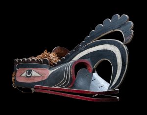 Many peoples of the Pacific Northwest built elaborate plank houses out of the region’s abundant cedar trees. The five-hundred-foot-long Suquamish Oleman House (or Old Man House), for instance, rested on the banks of Puget Sound.[21] Giant cedar trees were also carved and painted in the shape of animals or other figures to tell stories and express identities. These totem poles became the most recognizable artistic form of the Pacific Northwest, but people also carved masks and other wooden items, such as hand drums and rattles, out of the region’s great trees.