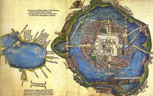 Militaristic migrants from northern Mexico, the Aztecs moved south into the Valley of Mexico, conquered their way to dominance, and built the largest empire in the New World. When the Spaniards arrived in Mexico they found a sprawling civilization centered around Tenochtitlán, an awe-inspiring city built on a series of natural and man-made islands in the middle of Lake Texcoco, located today within modern-day Mexico City. Tenochtitlán, founded in 1325, rivaled the world’s largest cities in size and grandeur.[29]