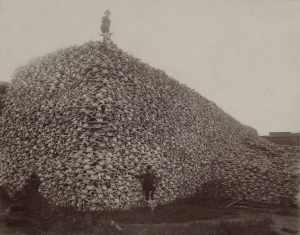 Others came to the Plains to extract the hides of the great bison herds. Millions of animals had roamed the Plains, but their tough leather supplied industrial belting in eastern factories and raw material for the booming clothing industry. Specialized teams took down and skinned the herds. The infamous American bison slaughter peaked in the early 1870s. The number of American bison plummeted from over ten million at midcentury to only a few hundred by the early 1880s. The expansion of the railroads allowed ranching to replace the bison with cattle on the American grasslands.[3]