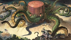 Between 1897 and 1904, over four thousand companies were consolidated down into 257 corporate firms. As one historian wrote, “By 1904 a total of 318 trusts held 40% of US manufacturing assets and boasted a capitalization of $7 billion, seven times bigger than the US national debt.”[24] With the twentieth century came the age of monopoly. Mergers and the aggressive business policies of wealthy men such as Carnegie and Rockefeller earned them the epithet robber barons. Their cutthroat stifling of economic competition, mistreatment of workers, and corruption of politics sparked an opposition that pushed for regulations to rein in the power of monopolies. The great corporations became a major target of reformers.