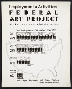 The New Deal enjoyed broad popularity. Democrats gained seats in the 1934 midterm elections, securing massive majorities in both the House and Senate. Bolstered by these gains, facing reelection in 1936, and confronting rising opposition from both the left and the right, Roosevelt rededicated himself to bold programs and more aggressive approaches, a set of legislation often termed the Second New Deal. It included a nearly five-billion dollar appropriation that in 1935 established the Works Progress Administration (WPA), a permanent version of the CWA, which would ultimately employ millions of Americans on public works projects. It would employ “the maximum number of persons in the shortest time possible,” Roosevelt said.[59] Americans employed by the WPA paved more than half-a-million miles of roads, constructed thousands of bridges, built schools and post offices, and even painted murals and recorded oral histories. Not only did the program build much of America’s physical infrastructure, it came closer than any New Deal program to providing the federal jobs guarantee Roosevelt had promised in 1932.