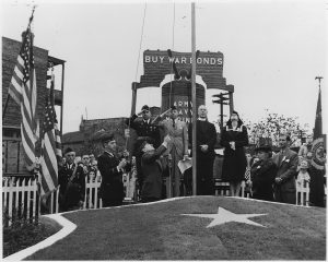 But the wartime economy boomed. The Roosevelt administration urged citizens to save their earnings or buy war bonds to prevent inflation. Bond drives were held nationally and headlined by Hollywood celebrities. Such drives were hugely successful. They not only funded much of the war effort, they helped tame inflation as well. So too did tax rates. The federal government raised income taxes and boosted the top marginal tax rate to 94 percent.