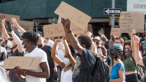 The ability of individuals to share stories through social media apps revolutionized the media landscape—smartphone technology and the democratization of media reshaped political debates and introduced new political questions. The easy accessibility of video capturing and the ability for stories to go viral outside traditional media, for instance, brought new attention to the tense and often violent relations between municipal police officers and African Americans. The 2014 death of Michael Brown in Ferguson, Missouri, sparked protests and focused the issue. It perhaps became a testament to the power of social media platforms such as Twitter that a hashtag, #blacklivesmatter, became a rallying cry for protesters and counterhashtags, #alllivesmatter and #bluelivesmatter, for critics.[49] But a relentless number of videos documenting the deaths of Black men at the hands of police officers continued to circulated across social media networks. The deaths of Eric Garner, twelve-year-old Tamir Rice, Philando Castile, and were captured on cell phone cameras and went viral. So too did the stories of Breonna Taylor and Botham Jean. “Say their names,” a popular chant at Black Lives Matters marches went. And then George Floyd was murdered.