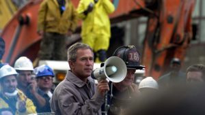 The attacks stunned Americans. Late that night, Bush addressed the nation and assured the country that “the search is under way for those who are behind these evil acts.” At Ground Zero three days later, Bush thanked first responders for their work. A worker said he couldn’t hear him. “I can hear you,” Bush shouted back, “The rest of the world hears you. And the people who knocked these buildings down will hear all of us soon.”