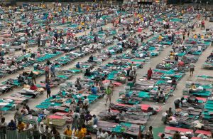 New Orleans suffered a direct hit, the levees broke, and the bulk of the city flooded. Thousands of refugees flocked to the Superdome, where supplies and medical treatment and evacuation were slow to come. Individuals died in the heat. Bodies wasted away. Americans saw poor Black Americans abandoned. Katrina became a symbol of a broken administrative system, a devastated coastline, and irreparable social structures that allowed escape and recovery for some and not for others. Critics charged that Bush had staffed his administration with incompetent supporters and had further ignored the displaced poor and Black residents of New Orleans.[24]
