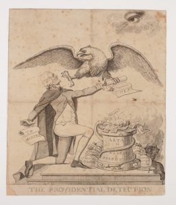 During the ratification debates, Alexander Hamilton had written of the wonders of the Constitution. “A nation, without a national government,” he wrote, would be “an awful spectacle.” But, he added, “the establishment of a Constitution, in time of profound peace, by the voluntary consent of a whole people, is a prodigy,” a miracle that should be witnessed “with trembling anxiety.”[40] Anti-Federalists had grave concerns about the Constitution, but even they could celebrate the idea of national unity. By 1795, even the staunchest critics would have grudgingly agreed with Hamilton’s convictions about the Constitution. Yet these same individuals could also take the cautions in Washington’s 1796 farewell address to heart. “There is an opinion,” Washington wrote, “that parties in free countries are useful checks upon the administration of the government and serve to keep alive the spirit of liberty.” This, he conceded, was probably true, but in a republic, he said, the danger was not too little partisanship, but too much. “A fire not to be quenched,” Washington warned, “it demands a uniform vigilance to prevent its bursting into a flame, lest, instead of warming, it should consume.”[41]