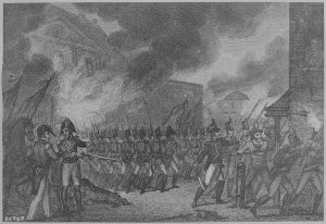 Two and a half months later the USS Constitution squared off with the HMS Guerriere. As the Guerriere tried to outmaneuver the Americans, the Constitution pulled along broadside and began hammering the British frigate. The Guerriere returned fire, but as one sailor observed, the cannonballs simply bounced off the Constitution’s thick hull. “Huzzah! Her sides are made of iron!” shouted the sailor, and henceforth, the Constitution became known as “Old Ironsides.” In less than thirty-five minutes, the Guerriere was so badly damaged that it was set aflame rather than taken as a prize.