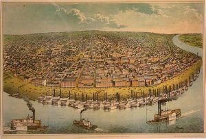 Most visibly, the market revolution encouraged the growth of cities and reshaped the lives of urban workers. In 1820, only New York had over one hundred thousand inhabitants. By 1850, six American cities met that threshold, including Chicago, which had been founded fewer than two decades earlier.[11] New technology and infrastructure paved the way for such growth. The Erie Canal captured the bulk of the trade emerging from the Great Lakes region, securing New York City’s position as the nation’s largest and most economically important city. The steamboat turned St. Louis and Cincinnati into centers of trade, and Chicago rose as it became the railroad hub of the western Great Lakes and Great Plains regions. The geographic center of the nation shifted westward. The development of steam power and the exploitation of Pennsylvania coalfields shifted the locus of American manufacturing. By the 1830s, for instance, New England was losing its competitive advantage to the West.
