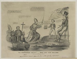 In England, an economic slump prompted Parliament to modernize British agriculture by revoking common land rights for Irish farmers. These policies generally targeted Catholics in the southern counties of Ireland and motivated many to seek greater opportunity elsewhere. The booming American economy pulled Irish immigrants toward ports along the eastern United States. Between 1820 and 1840, over 250,000 Irish immigrants arrived in the United States.[44] Without the capital and skills required to purchase and operate farms, Irish immigrants settled primarily in northeastern cities and towns and performed unskilled work. Irish men usually emigrated alone and, when possible, practiced what became known as chain migration. Chain migration allowed Irish men to send portions of their wages home, which would then be used either to support their families in Ireland or to purchase tickets for relatives to come to the United States. Irish immigration followed this pattern into the 1840s and 1850s, when the infamous Irish Famine sparked a massive exodus out of Ireland. Between 1840 and 1860, 1.7 million Irish fled starvation and the oppressive English policies that accompanied it.[45] As they entered manual, unskilled labor positions in urban America’s dirtiest and most dangerous occupations, Irish workers in northern cities were compared to African Americans, and anti-immigrant newspapers portrayed them with apelike features. Despite hostility, Irish immigrants retained their social, cultural, and religious beliefs and left an indelible mark on American culture.