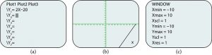 For example, the equation [latex]y=2x-20[/latex] has been entered in the TI-84 Plus shown in Figure 8a. In Figure 8b, the resulting graph is shown. Notice that we cannot see on the screen where the graph crosses the axes. The standard window screen on the TI-84 Plus shows [latex]10\le x\le10,[/latex] and [latex]-1\le y\le10.[/latex] See Figure 8c.