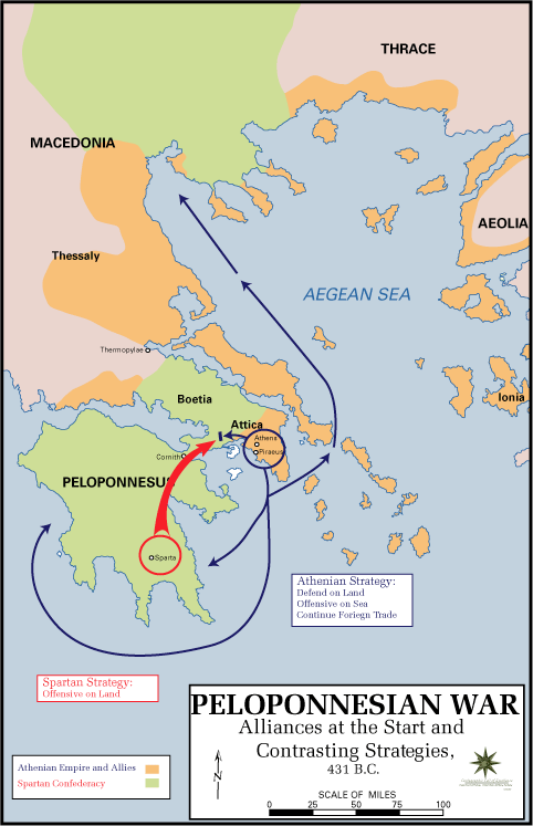 At the time of the war’s declaration, no one thought that it would last twenty-seven years and would ultimately embroil the entire Greek-speaking world. Rather, the Spartans expected that they would march with an army to Athens, fight a decisive battle, then return home forthwith. The long duration of the war, however, was partly the result of the different strengths of the two leading powers. Athens was a naval empire, with allies scattered all over the Ionian Sea. Sparta, on the other hand, was a land-locked power with supporters chiefly in the Peloponnese and with no navy to speak of at the outset of the war.