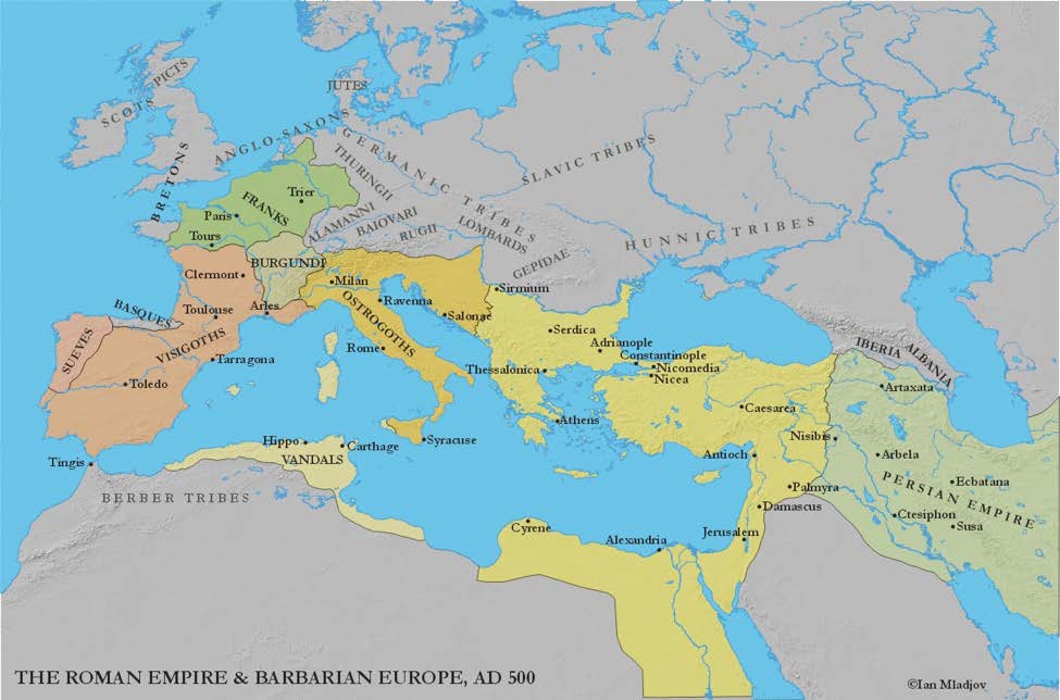 Full-size image of Map 7.1 – The Roman Empire and Barbarian Europe 500 CE