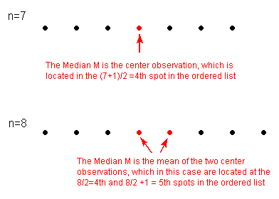 If n is odd, the median M is the center observation in the ordered list. This observation is the one “sitting” in the (n + 1)/2 spot in the ordered list.