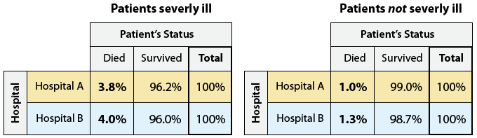 we find that Hospital A has a higher death rate (3%) than Hospital B (2%). Should we jump to the conclusion that a sick patient admitted to Hospital A is 50% more likely to die than if he/she were admitted to Hospital B? Not so fast …