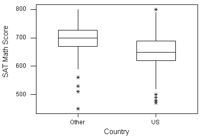 For U.S. colleges and universities, a standard entrance examination is the SAT test. The side-by-side boxplots below provide evidence of a relationship between the student’s country of origin (the United States or another country) and the student’s SAT Math score.